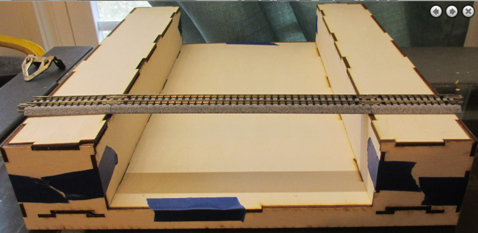 N Scale T-trak bridge drop module the measures 12 1/8 by 14 inches with a 2 in drop in the center. The bridge module is set up for using the Kato 20-40 or 20-45 sections on the ends and either the Kato 20-010186mm track section or the bridge in the center. I'm using the 20-045 flex connection section for my display module and our bridges so using flex track in the center. Kit includes two track setting jigs and all the parts for one module LESS TRACK. Holes are provided for the optional back board and the side connector plate. Kits 3804 and 3806.